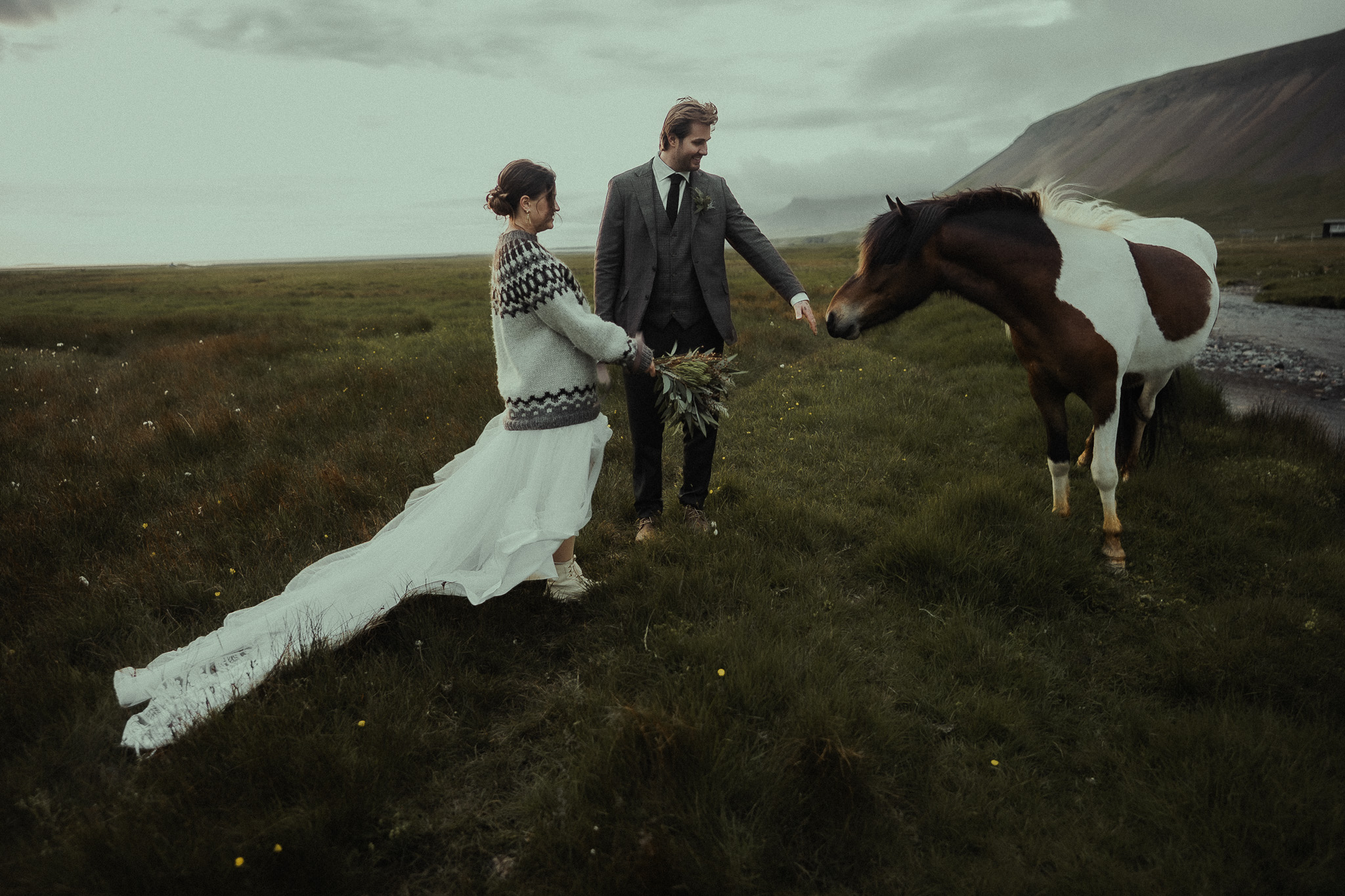 We began the day with getting ready and a private first look near the iconic black church of Budakirkja. The overcast skies and soft wind created a quiet, intimate atmosphere — just the two of them, fully present in the moment.